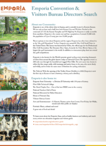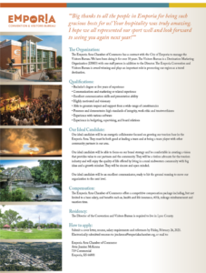 Read More →The Emporia Area Chamber of Commerce is looking for a Membership Director. This person will be responsible for planning and implementation of activities to retain, recruit and solicit memberships and engagement in the Emporia Area Chamber of Commerce. The successful candidate will be well organized and detail oriented with the ability to function smoothly in…